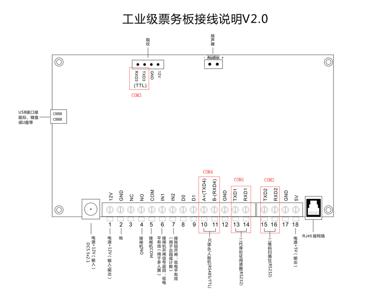 说明:票务版有三个串口,一般用于接外接的设备,比如读卡器、身份证阅读器、指纹机和二维码扫描仪等。